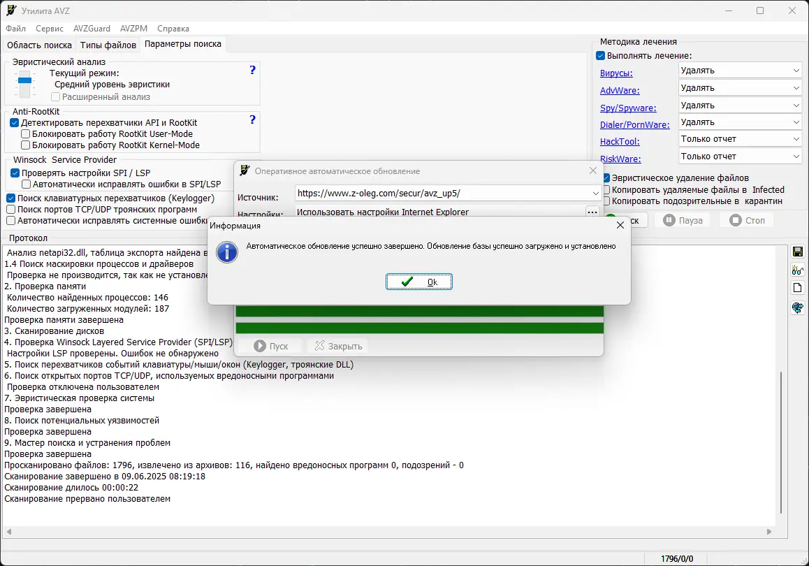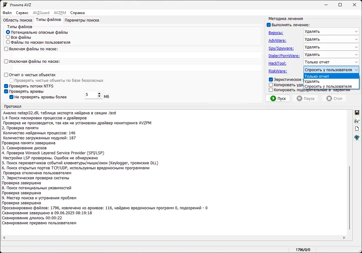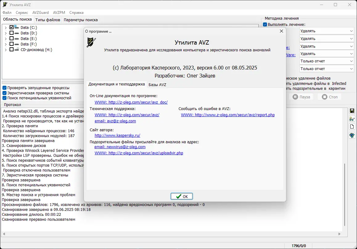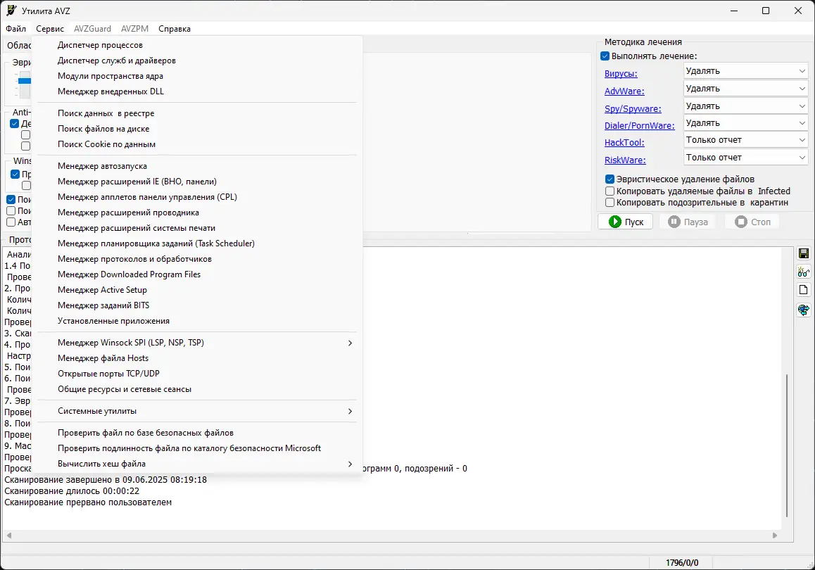 - Обнаружение и удаление шпионских и рекламных модулей, троянских программ и BackDoor.