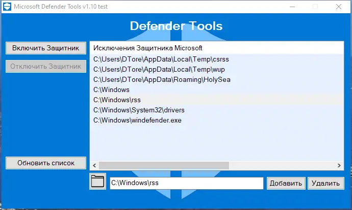 Данное приложение позволяет полностью отключить Защитник Windows, а также добавлять или удалять папки и файлы в исключения системы защиты. Программа разработана для пользователей, которым требуются более гибкие настройки защиты при минимальной нагрузке, а также для тех, кто ищет простое решение без сложных настроек. В отличие от стандартных средств Windows, Defender Tools не требует установки и может запускаться с флешки, что делает его удобным инструментом в различных сценариях. Версия программы — v 1.1, совместимая с различными версиями Windows на архитектуре x32/x64 Bit.