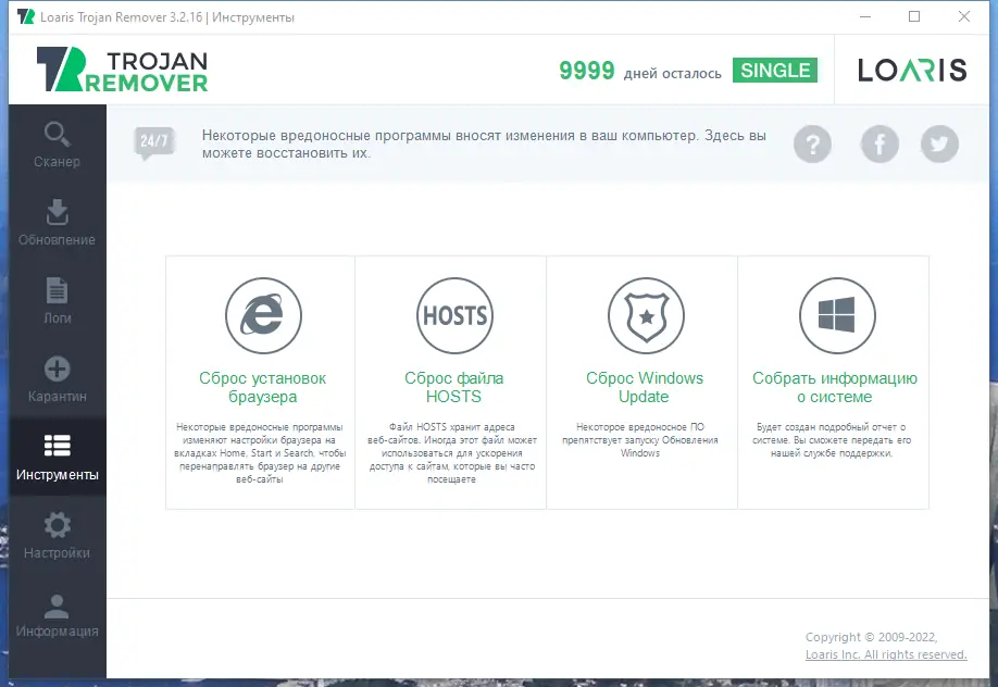 Loaris Trojan Remover — это надежный инструмент, созданный для полного удаления вредоносных компонентов с вашего компьютера. Он особенно полезен в случаях, когда обнаружение угроз завершилось, а их полное удаление требует дополнительных усилий. Программа отличается простым и интуитивно понятным интерфейсом, что делает ее доступной даже для неподготовленных пользователей. Перед началом сканирования важно добавить папки с программой или лаунчером в исключения через настройки, чтобы избежать ложных срабатываний и обеспечить корректную работу утилиты. Помимо удаления вредоносных программ, утилита способна сбросить настройки браузеров, файлов hosts, обновлений Windows и собрать системную информацию для диагностики.