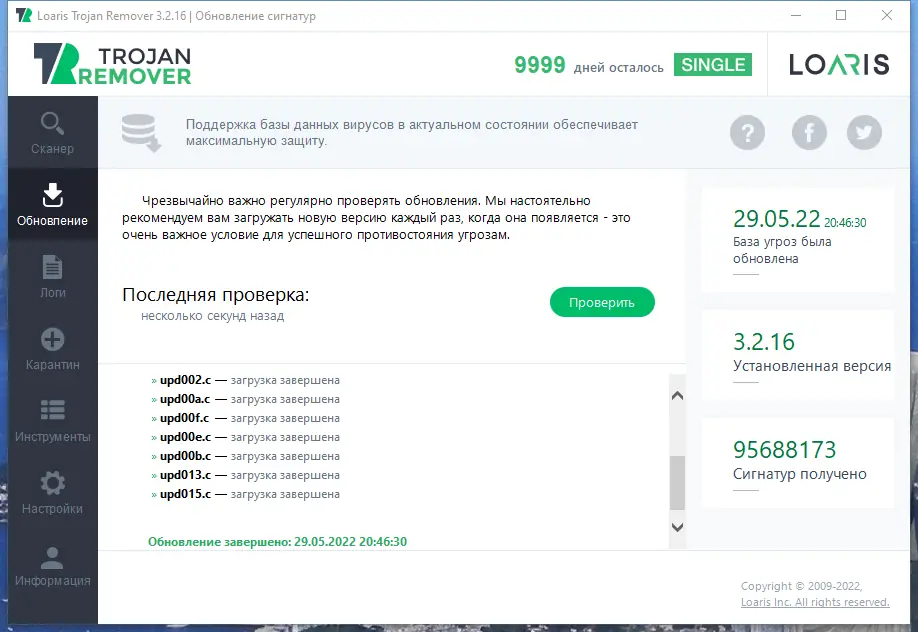 - Завершение установки и первичная настройка программы, включая обновление базы данных угроз.