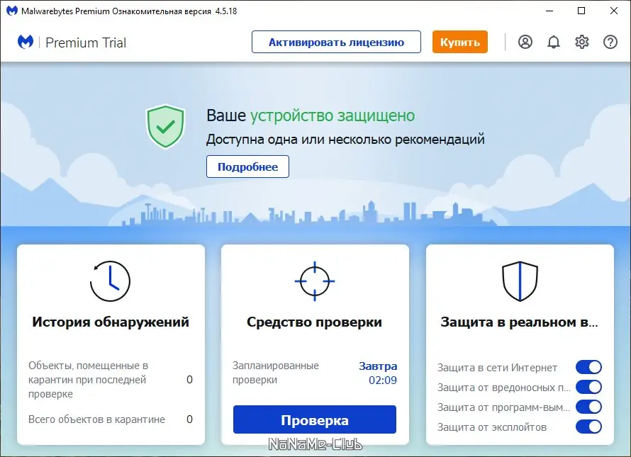 - Динамическая технология Malwarebytes Chameleon, позволяющая запускать активную защиту даже при блокировке вредоносными программами.