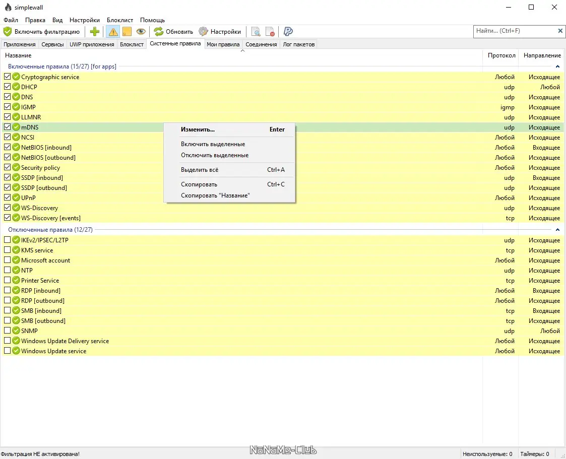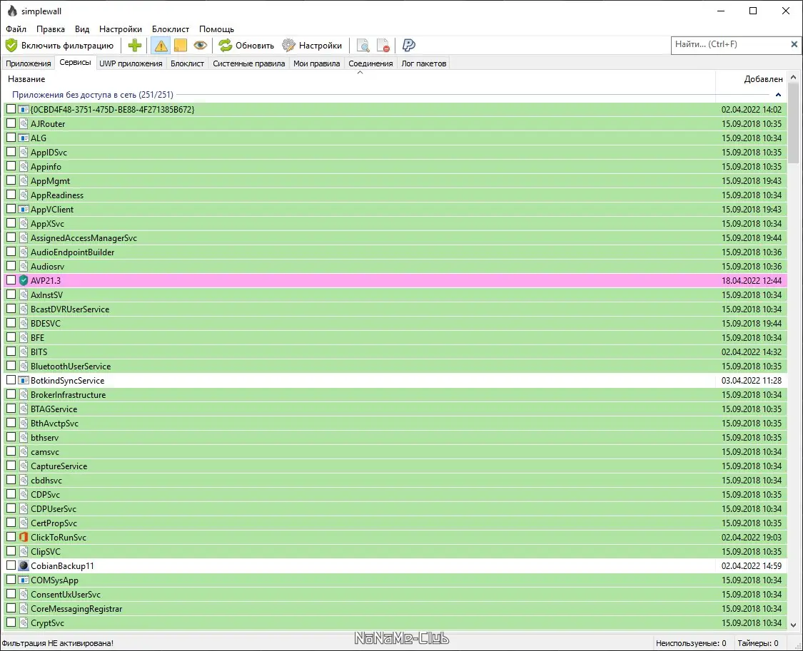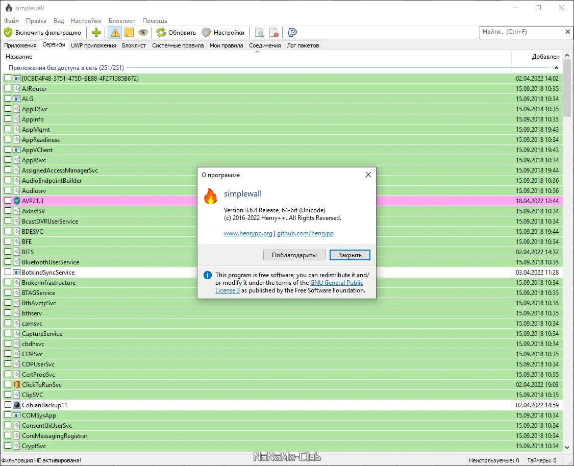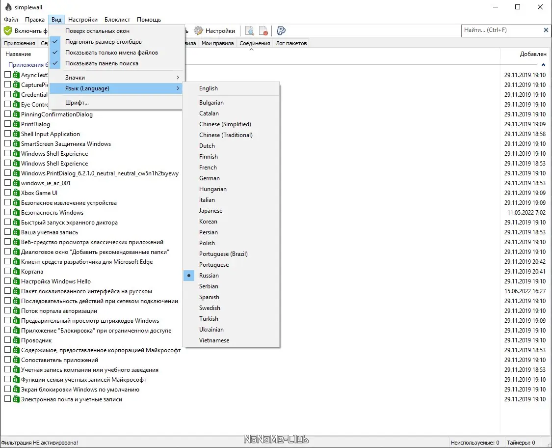 Простой в использовании и нетребовательный к ресурсам компьютера фаервол, имеющий все необходимые опции для блокировки входящего и исходящего трафика приложений. Поддерживаются два режима работы: фильтрация по белому или черному списку. Работа simplewall реализована через возможности Windows Filtering Platform.