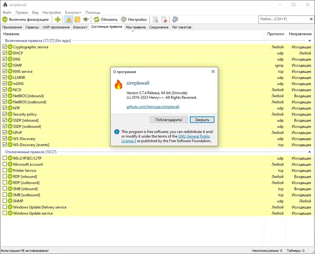 Простой в использовании и нетребовательный к ресурсам компьютерный фаервол с полным набором опций для блокировки входящего и исходящего трафика приложений. Поддерживаются режимы фильтрации по белому и черному спискам. Работа инструмента реализована через возможности Windows Filtering Platform (WFP), что обеспечивает высокую эффективность и стабильность. Поддержка систем Windows 7, 8/8.1, 10 и 11 делает его универсальным решением для различных версий операционной системы. Бесплатно распространяется с открытым исходным кодом, что гарантирует безопасность и прозрачность работы.