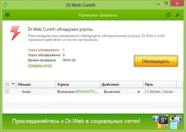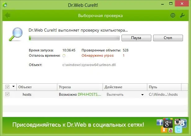 Обратите внимание, что при использовании Dr.Web CureIt! не требуется отключение установленного антивируса и другие дополнительные настройки.