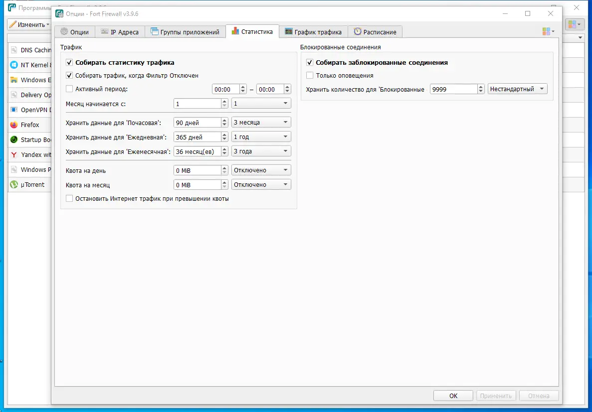 - Блокировка всех или части трафика с возможностью настройки белых и чёрных списков