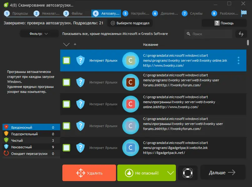 - Проверка и удаление потенциально-нежелательных программ и рекламных модулей.