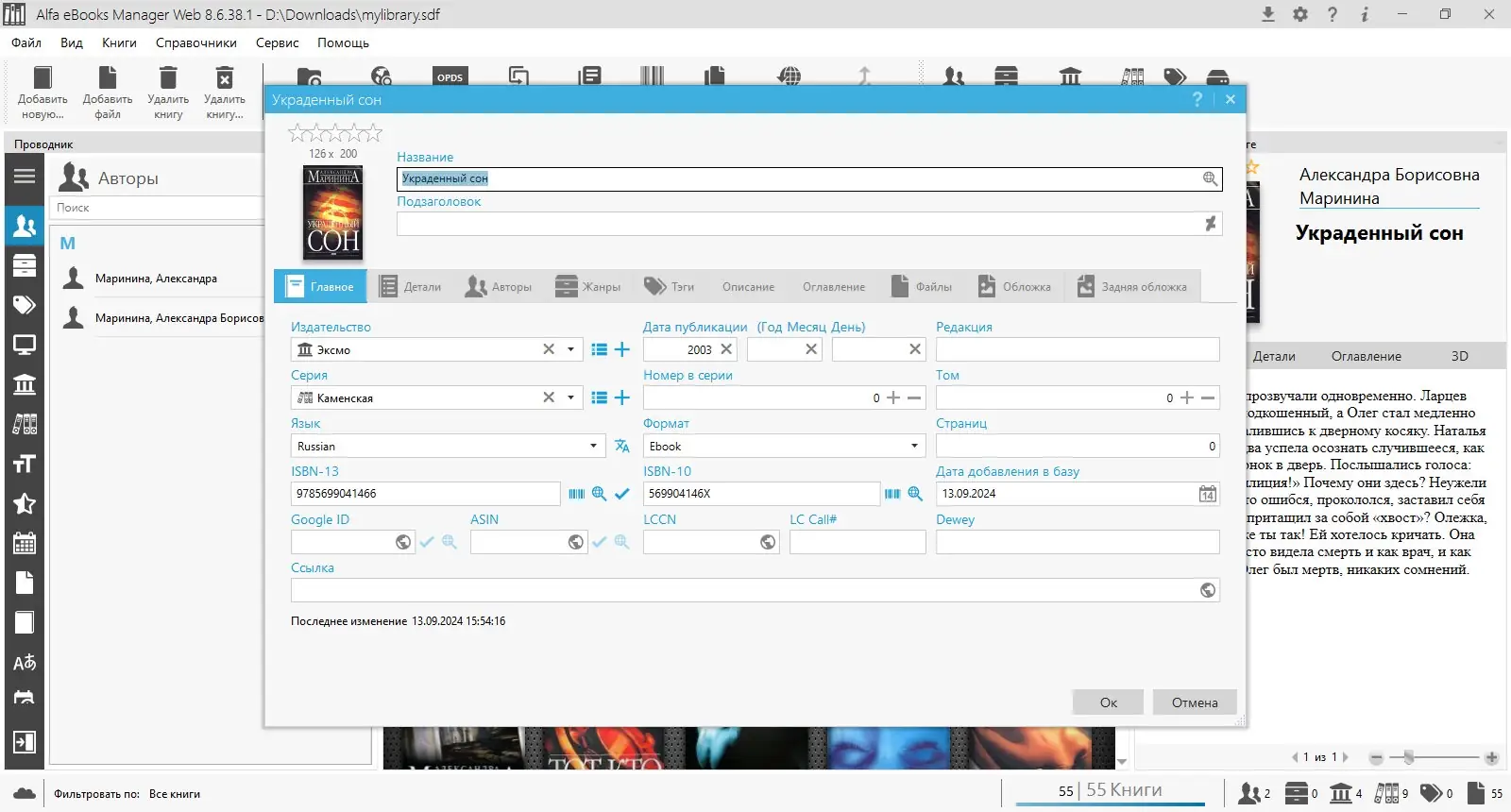 Alfa eBooks Manager — одна из самых популярных программ для создания и упорядочивания электронной и бумажной библиотеки. Она позволяет аккуратно систематизировать все книги, хранить подробные карточки с метаданными, добавлять теги и жанры, редактировать информацию, а также читать книги с помощью встроенного Alfa Reader или другого связанного софта. Программа поддерживает работу на операционной системе Windows 7, 8/8.1, 10, 11 (x32/x64 Bit) и совместима с различными форматами электронных книг, включая PDF, EPUB, MOBI, FB2, TXT, DJVU, CBR/CBZ и многие другие. Включены функции автоматического сканирования дисков, массового импорта данных из внешних источников, интеграция с Goodreads, Литрес и Books.ru. Alfa eBooks Manager позволяет не только организовать библиотеку, но и слушать аудиокниги, конвертировать форматы, а также управлять базами данных через веб-интерфейс в версии Web редакция.