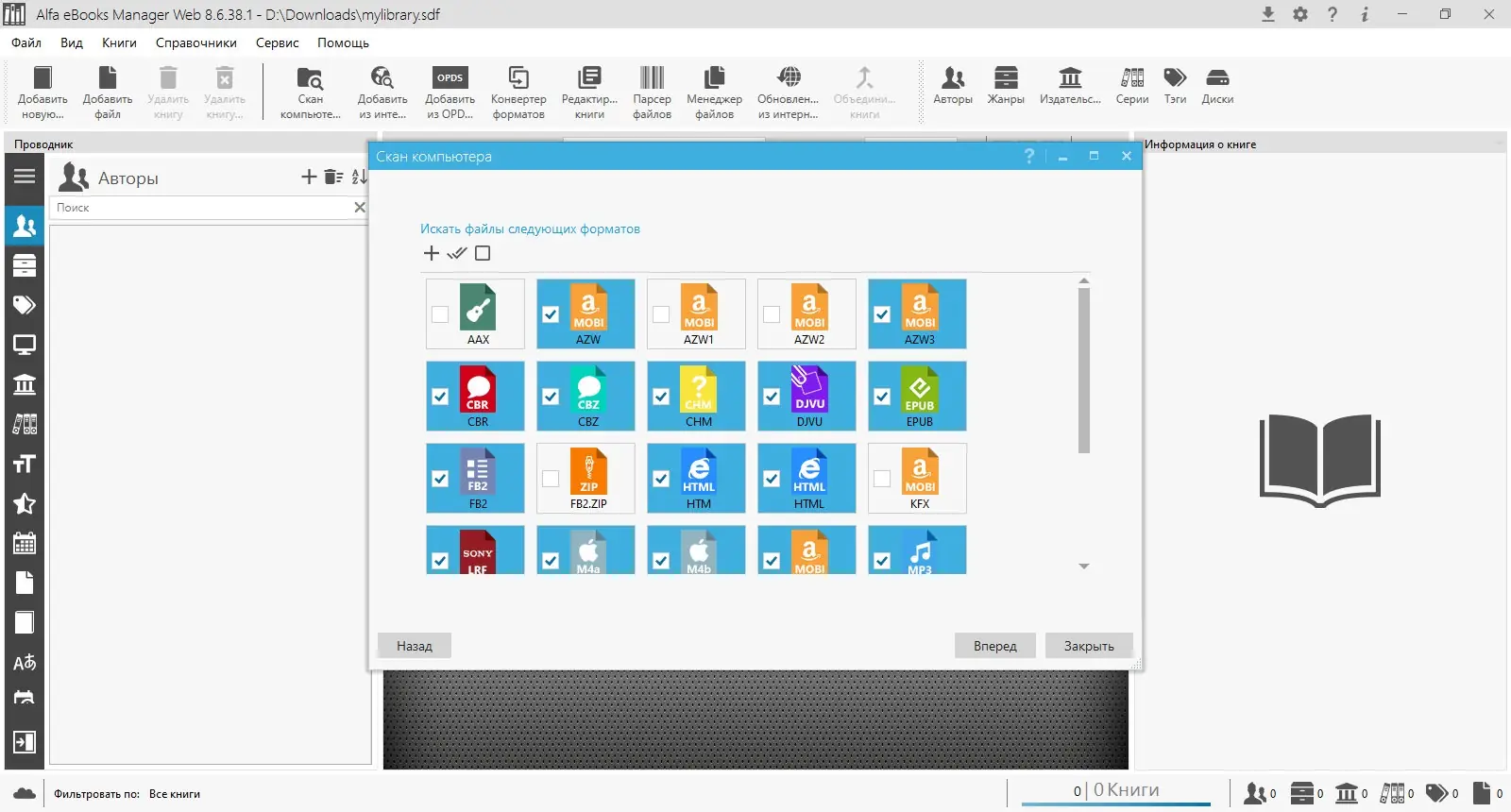 Alfa eBooks Manager — это мощная программа для организации вашей личной библиотеки, которая отлично подойдет как для любителей читать, так и для студентов, ученых и владельцев бизнес-библиотек. Создайте единую базу данных для бумажных и электронных книг, упростите их поиск и управление, а также получите возможность быстро просканировать весь компьютер и добавить новые книги автоматически.