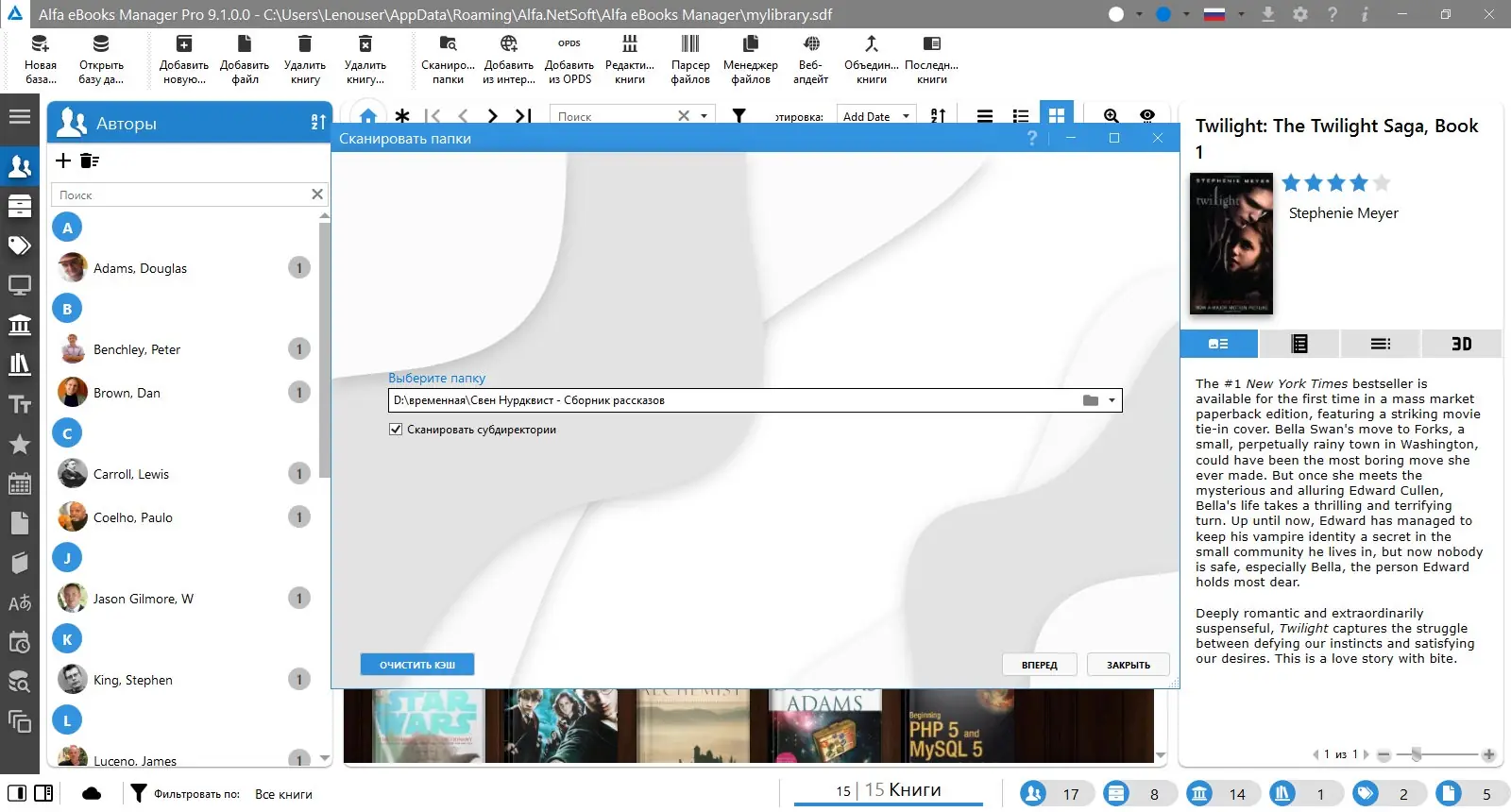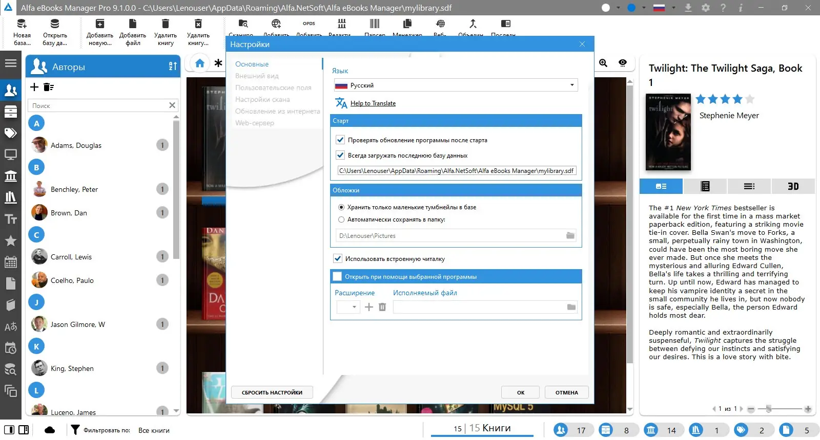 Alfa eBooks Manager — это мощный инструмент, позволяющий создать на вашем компьютере единую библиотеку для электронных и бумажных книг. Программа обладает функциями автоскана всего компьютера для автоматического добавления книг, поддержки различных форматов и интеграции с популярными сайтами для получения актуальных метаданных и обложек. Встроенные читалка и аудиоплеер позволяют читать и прослушивать книги без дополнительных программ. Удобный интерфейс на русском языке обеспечивает простоту использования, а возможность редактировать карточки книг, присваивать теги и создавать собственные поля делает управление коллекцией максимально гибким.