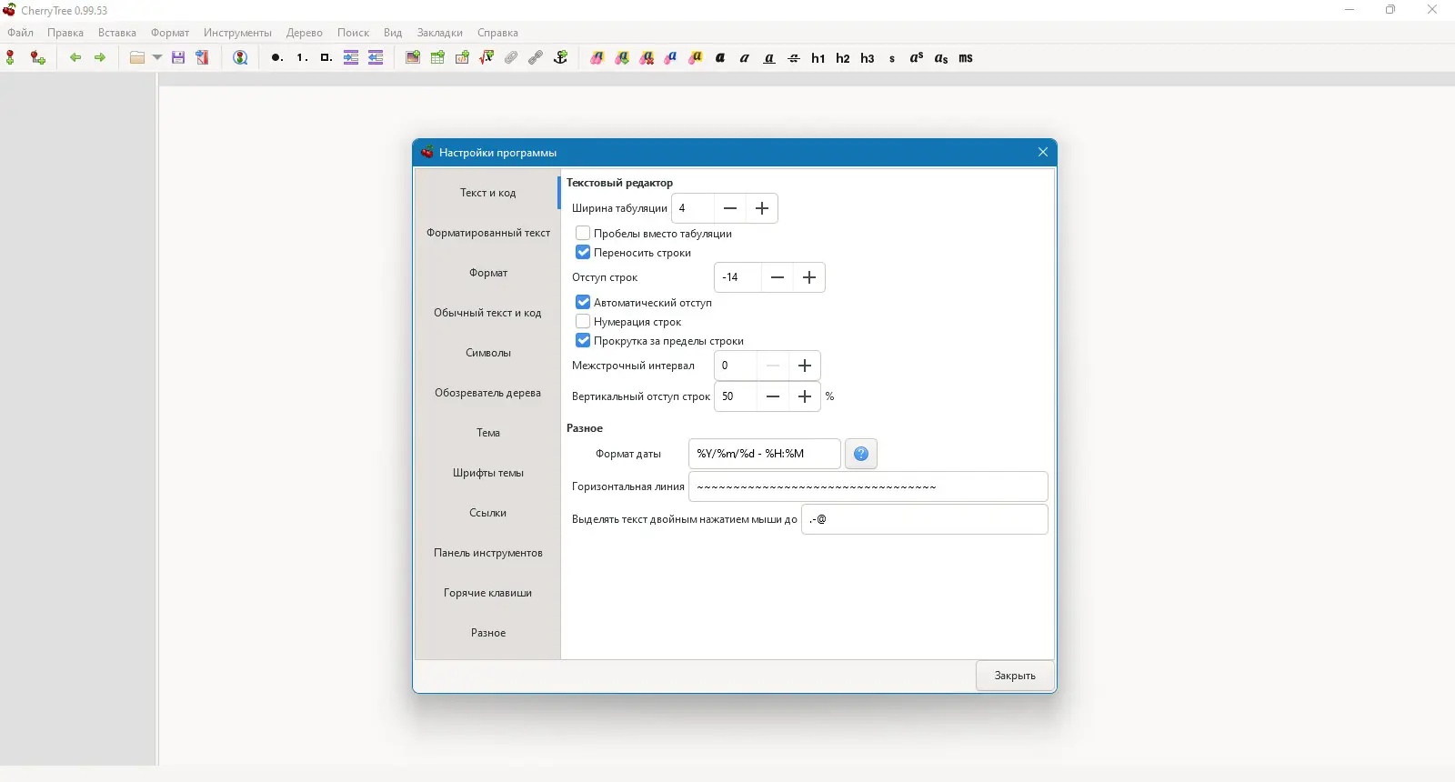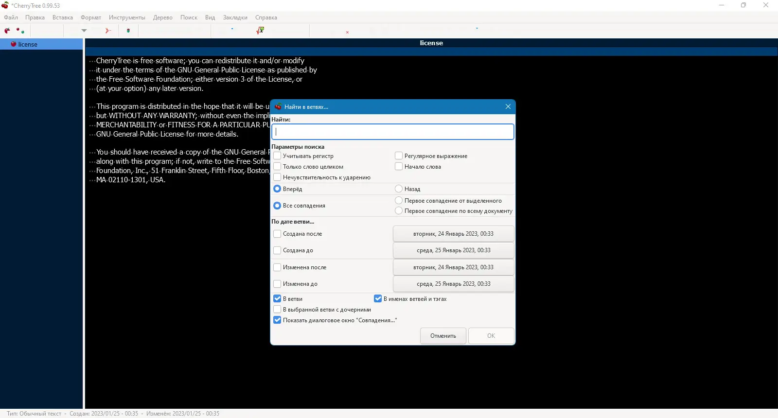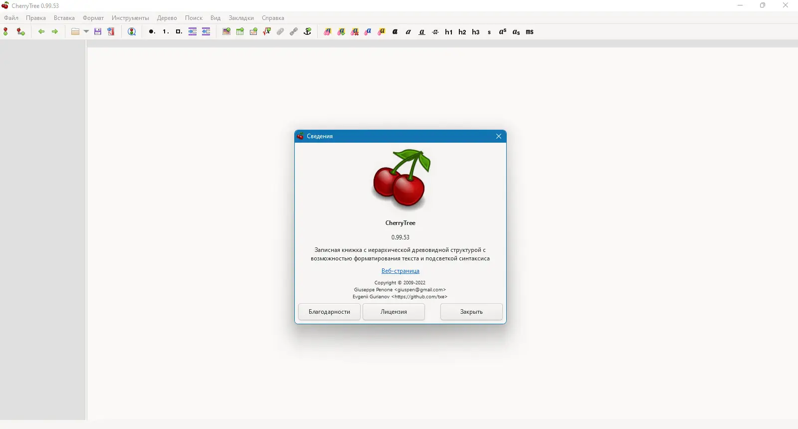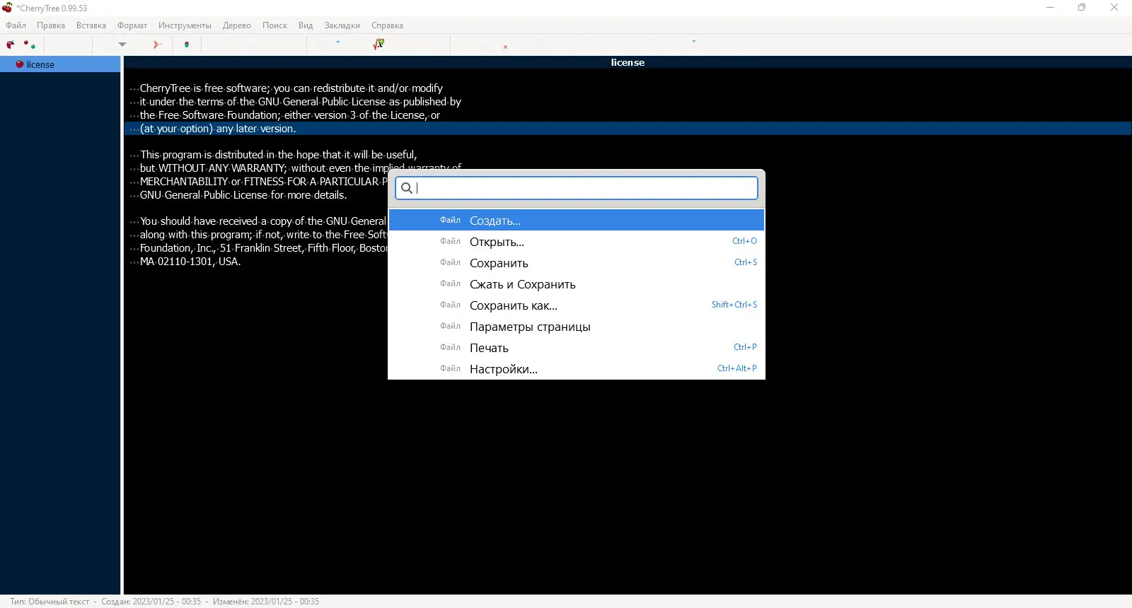 CherryTree — это функциональное приложение для ведения заметок, которое автоматически запустится после установки и поддержки русского языка. В программе можно создавать сложную иерархическую структуру заметок, использовать подсветку синтаксиса и защищать записи паролем. Благодаря наличию расширенных возможностей импорта и экспорта, а также поддержке печати и интеграции с другими инструментами, она подходит для ведения как личных дневников, так и профессиональной документации.