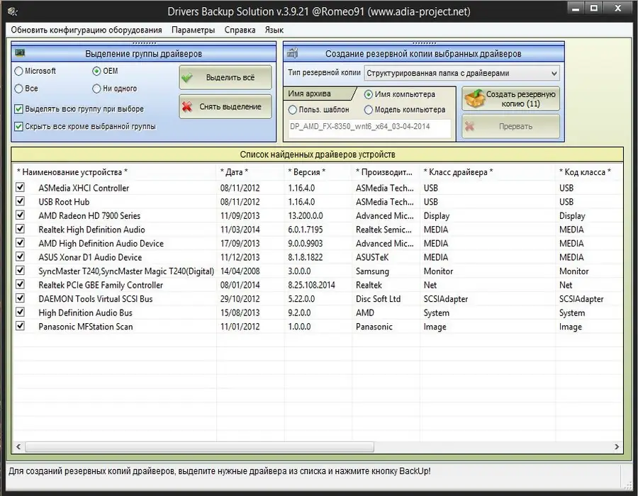 - Возможность резервного копирования драйверов для последующего восстановления.