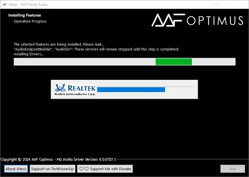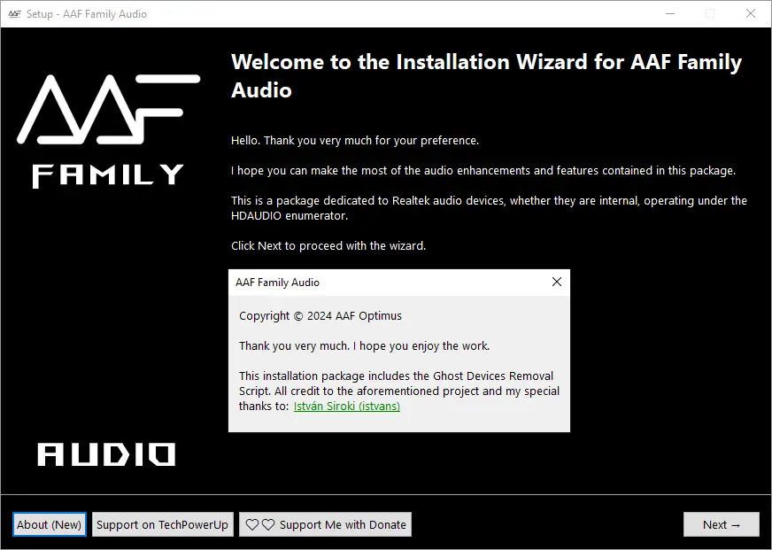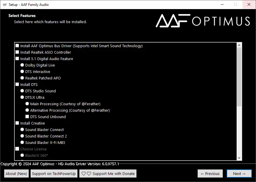 - Запустите установочный файл AAF Family DCH Audio Realtek и выберите необходимые компоненты и опции.