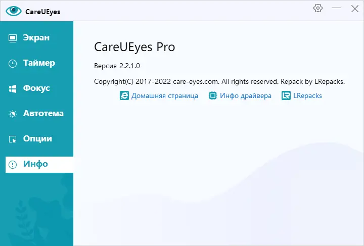 Основные функции позволяют легко настроить режим работы, выбрать готовые шаблоны или создать собственные сценарии использования компьютера. Поддерживается автоматическая настройка фильтров синего света, смена цветовой температуры и яркости, а также автоматическое отключение дисплея для отдыха глаз. Встроенные напоминания, плавное изменение параметров и поддержку нескольких мониторов делают CareUEyes удобным и надежным помощником в заботе о зрении.