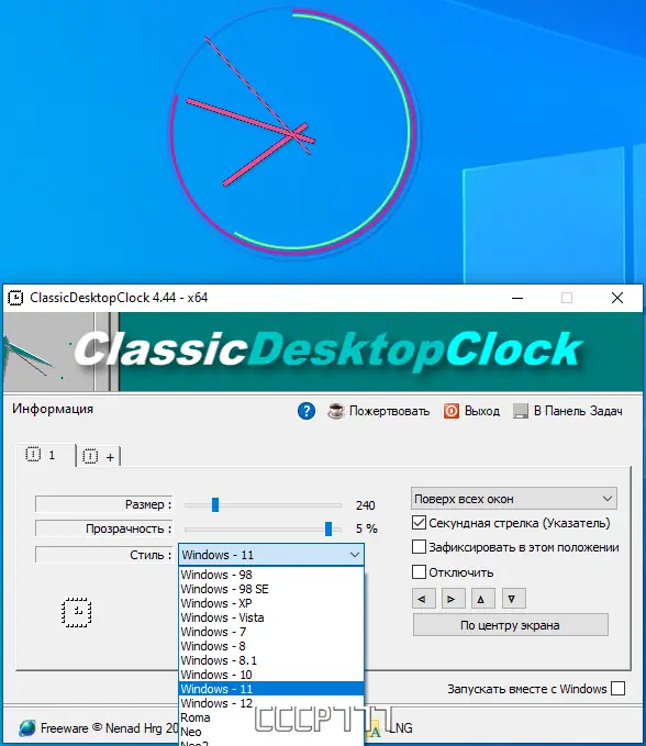 - Свободное задание положения часов на рабочем столе.