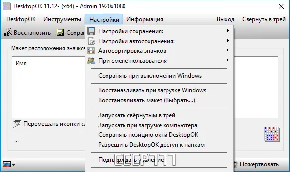 Обратите внимание, что при переносе файла «DesktopOK.ini» в другую папку, пользователь сохраняет свои настройки, поэтому рекомендуется создавать резервные копии файла перед переустановкой системы или переносом.