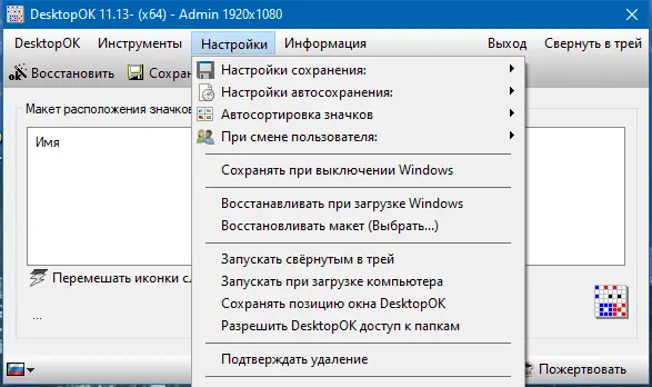 - Настроить параметры и начать использовать инструмент для сохранения положения значков.