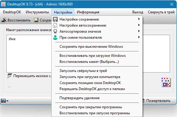 - Сохранение и восстановление позиций значков для различных разрешений экрана.