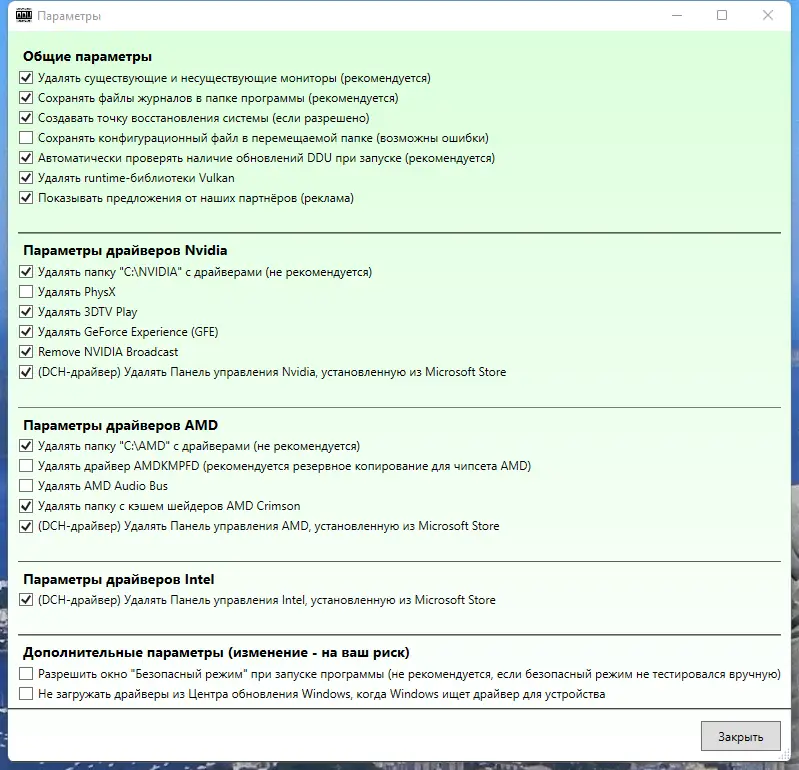 - Полное и бесследное удаление драйверов видеокарт AMD, NVIDIA, Intel, а также драйверов звуковых карт Realtek и Sound Blaster.