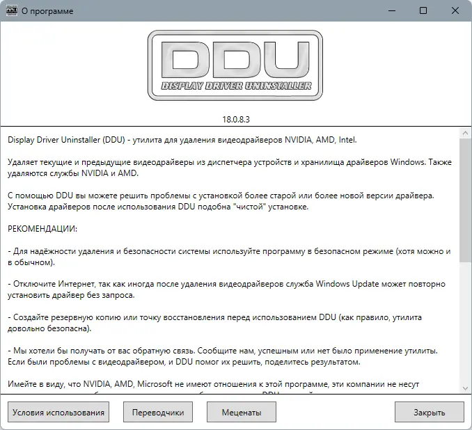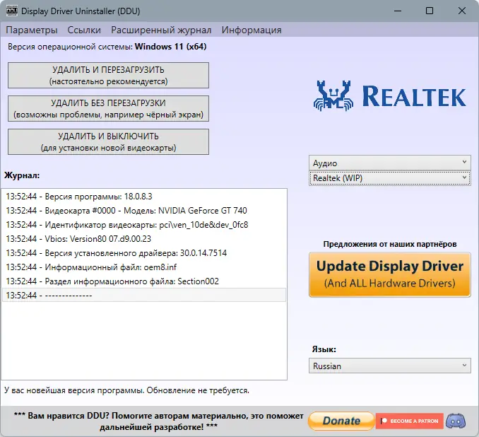 - Полное и бесследное удаление драйверов видеокарт AMD, NVIDIA, Intel и аудиоустройств Realtek/Sound Blaster.