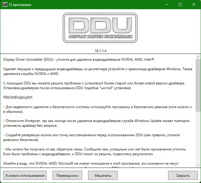 - Перед первым запуском рекомендуется перезагрузить систему в безопасном режиме для максимальной эффективности удаления драйверов.