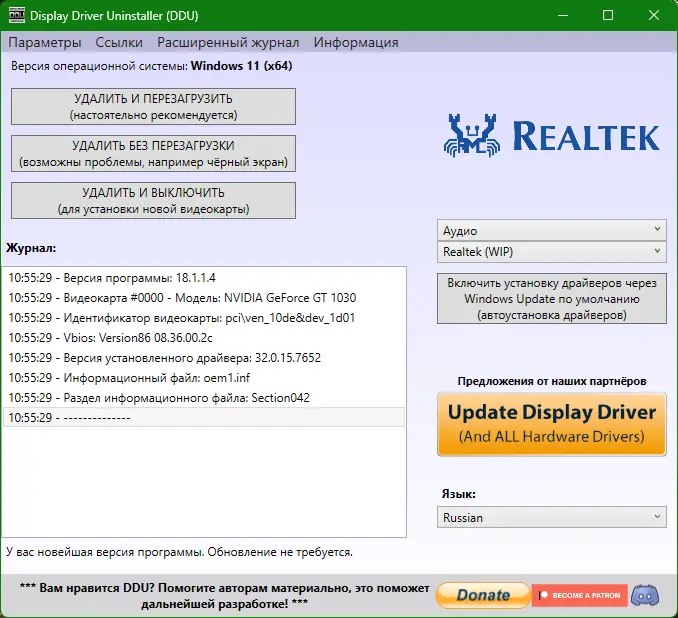 Также к особенностям относится автоматическая проверка и обновление, возможность сохранять журналы действий, а интерфейс выполнен так, что все параметры доступны из одного окна. Есть поддержка русского языка и возможность использовать портативную версию, которая не требует инсталляции и идеально подходит для быстрого удаления драйверов на любом ПК.