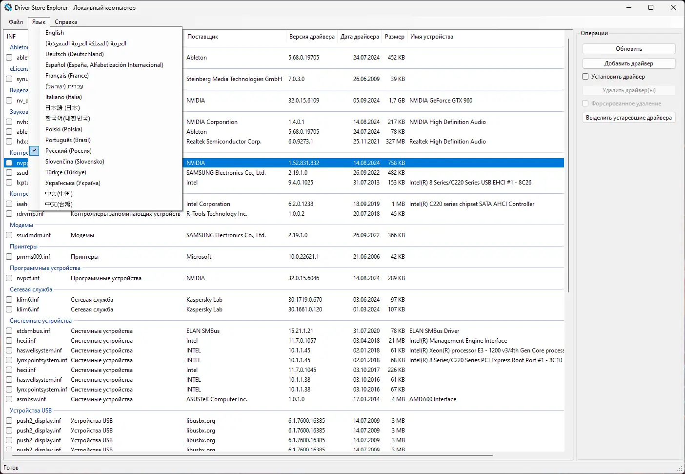 - Многофункциональность: добавление, удаление, экспорт и принудительное удаление драйверов.
