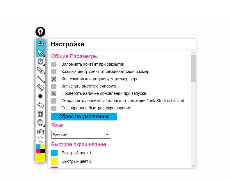 - Настройка инструментов «карандаш» и «маркер» с регулировкой толщины и цвета