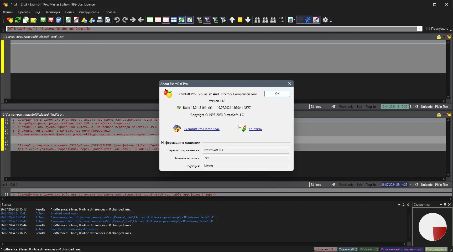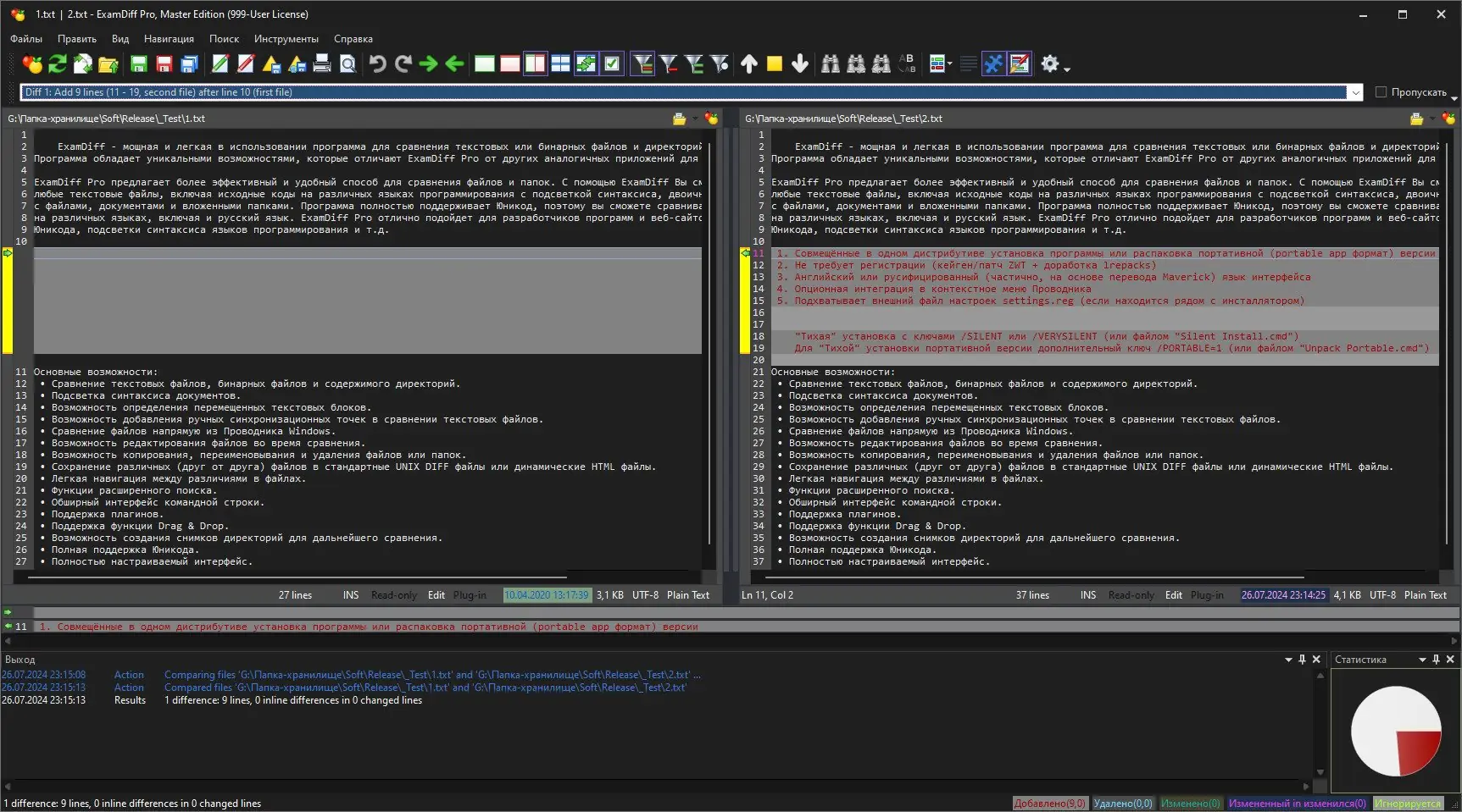 ExamDiff — мощная и легкая в использовании программа для сравнения текстовых или бинарных файлов и директорий. Она обладает уникальными возможностями, позволяющими эффективно сравнивать любые типы документов, включая исходные коды с подсветкой синтаксиса и файлы на различных языках, полностью поддерживая Юникод. Разработана специально для разработчиков и специалистов, которым важно быстро находить различия между файлами или папками, а также выполнять дополнительные операции с файлами прямо в процессе сравнения.