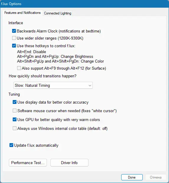 Бесплатное приложение для автоматической настройки цветовой температуры экрана с целью защиты зрения и повышения комфорта во время работы за компьютером или ноутбуком.