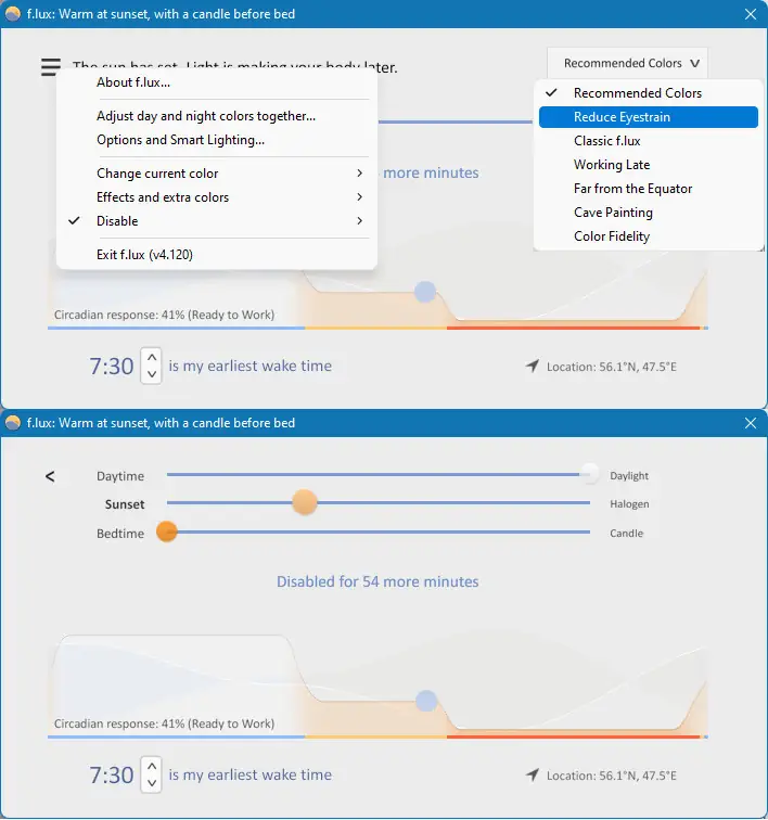 Это универсальный инструмент, который помогает минимизировать нагрузку на глаза, корректируя оттенки дисплея в зависимости от времени суток. Благодаря интеграции с сервером Google Maps пользователь может автоматически настраивать параметры в соответствии с географическим положением, обеспечивая плавное переключение между дневными и ночными режимами. Программа автоматически регулирует холодные и тёплые оттенки, яркость и резкость дисплея, что способствует комфортной работе и снижению утомляемости глаз. В дополнение доступны ручные настройки, а также функции виртуального засыпания и контроля сна для повышения эффективности и заботы о здоровье.