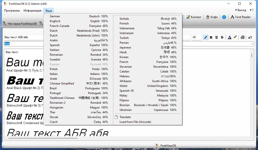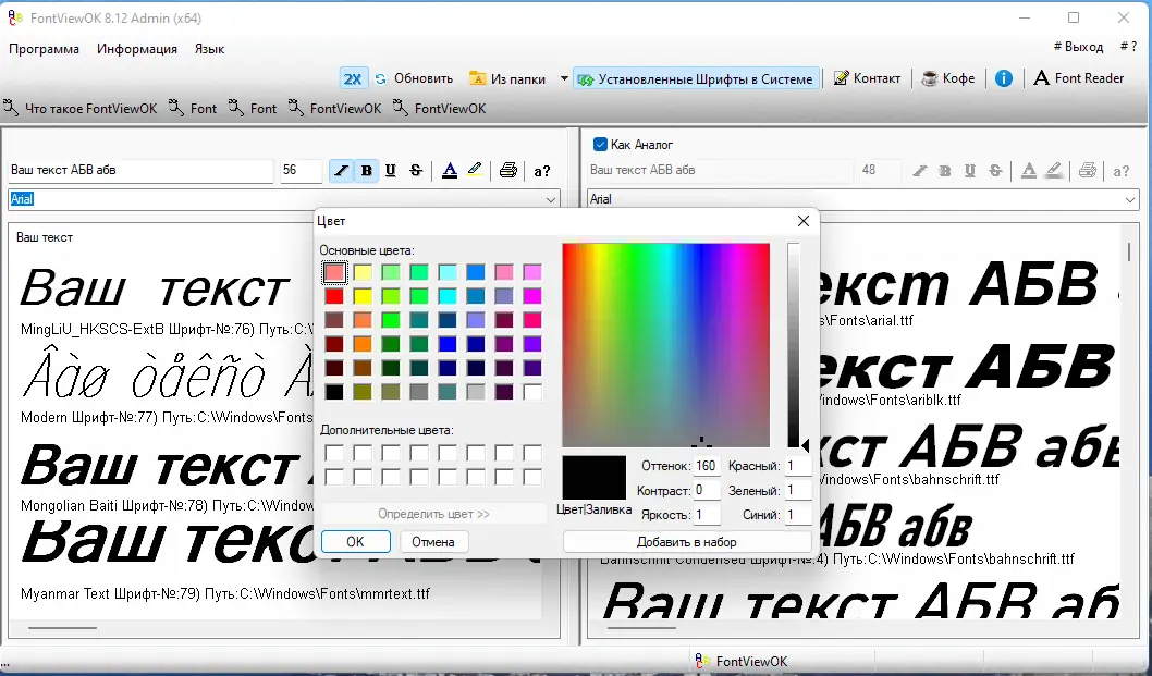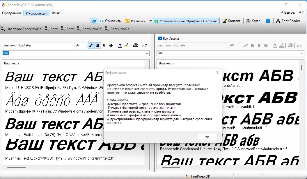 - Отображение всех установленных шрифтов в системе