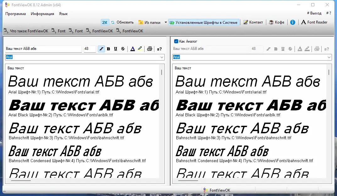 Перед Вами компактное решение, которое позволяет отображать все установленные в системе шрифты и работать с ними напрямую. Основная особенность — возможность вводить любой текст в специальное поле и сразу видеть его отображение в выбранном стиле шрифта. Это удобно для быстрого оценки внешнего вида и выбора подходящего шрифта для различных целей. Помимо изменений цвета, размеры и стиля, пользователи могут сравнивать два шрифта в предварительных просмотрах, что значительно облегчает процесс подбора и тестирования варианта.