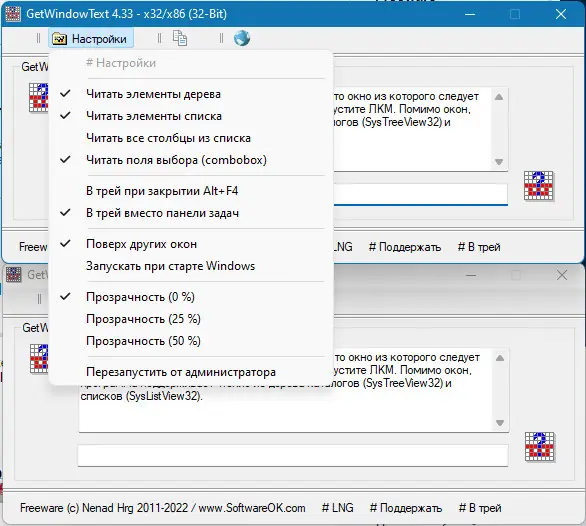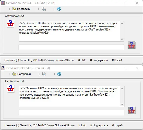 GetWindowText — небольшая и портативная утилита, предназначенная для чтения и копирования текста из окон и элементов интерфейса, которые обычно недоступны стандартными средствами. Перетащите значок программы на нужный элемент, и в окне GetWindowText отобразится содержимое, которое можно легко скопировать и использовать. Поддерживаются деревья каталогов (SysTreeView32), комбобоксы и списковые представления (SysListView32), что делает утилиту универсальным инструментом для различных задач.