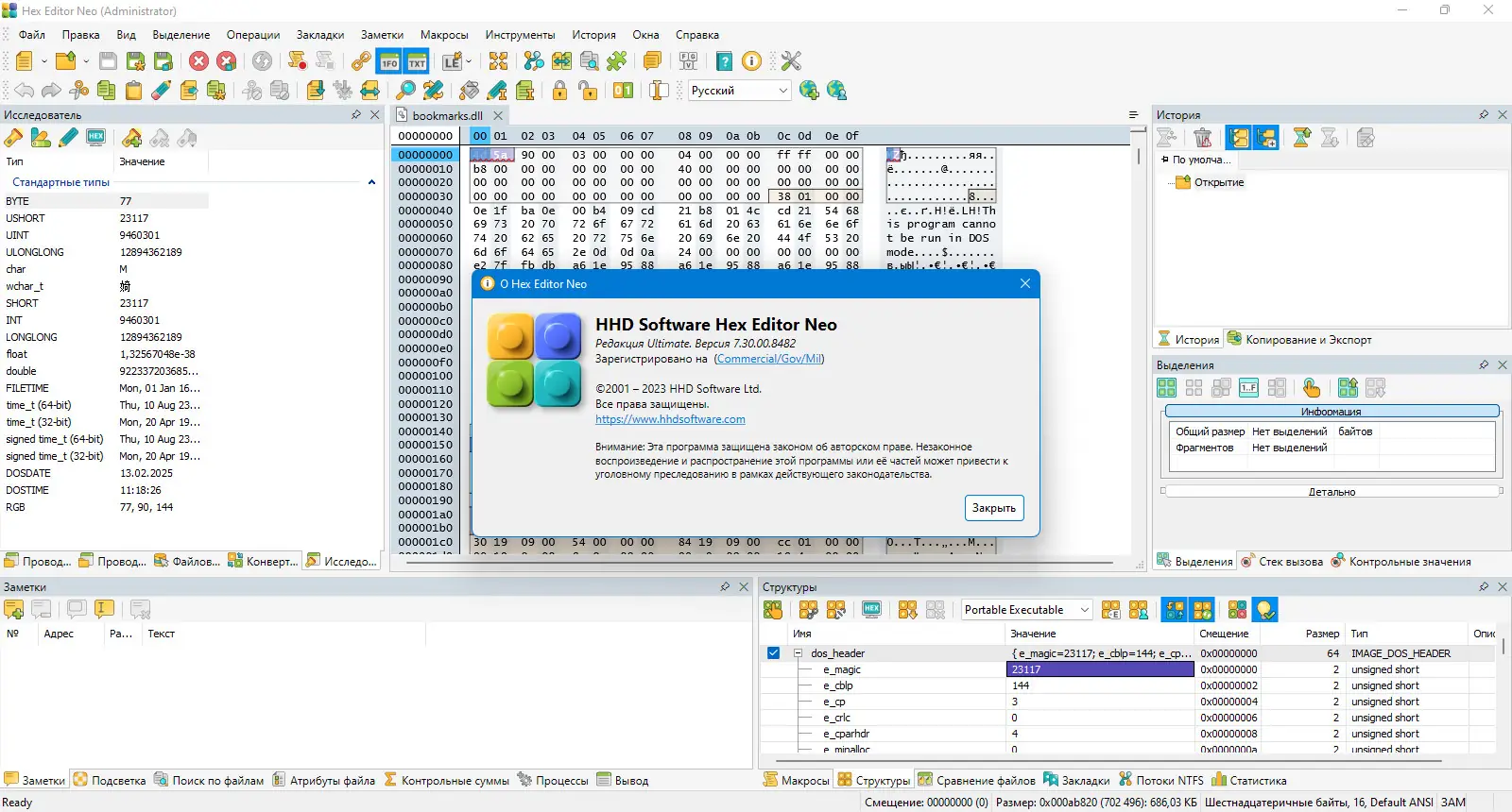 Данная программа обладает многооконным интерфейсом и поддержкой различных режимов, что делает работу с файлами максимально эффективной и удобной. Вы можете легко просматривать, искать, заменять и отлаживать данные, а также использовать функции типа, вырезания, копирования, вставки, заполнения, удаления, импорта и экспорта данных. Поддерживаются режимы перезаписи и вставки, а также обмен двоичными данными с другими приложениями через буфер обмена. Программа обеспечивает сохранение истории операций и множество режимов поиска и замены числовых данных. Особенность Hex Editor Neo заключается в способности анализа очень больших файлов и дисков, что делает его незаменимым инструментом в работе с большими объемами данных и в разработке.