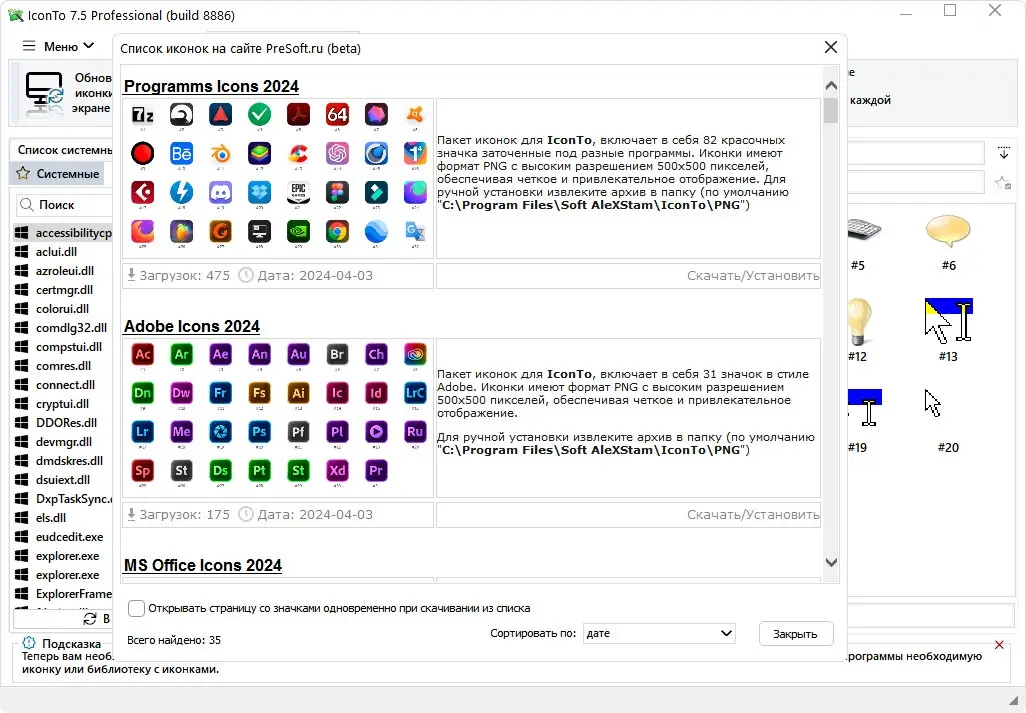 - Поддержка установки значков на файлы DLL и системные разделы