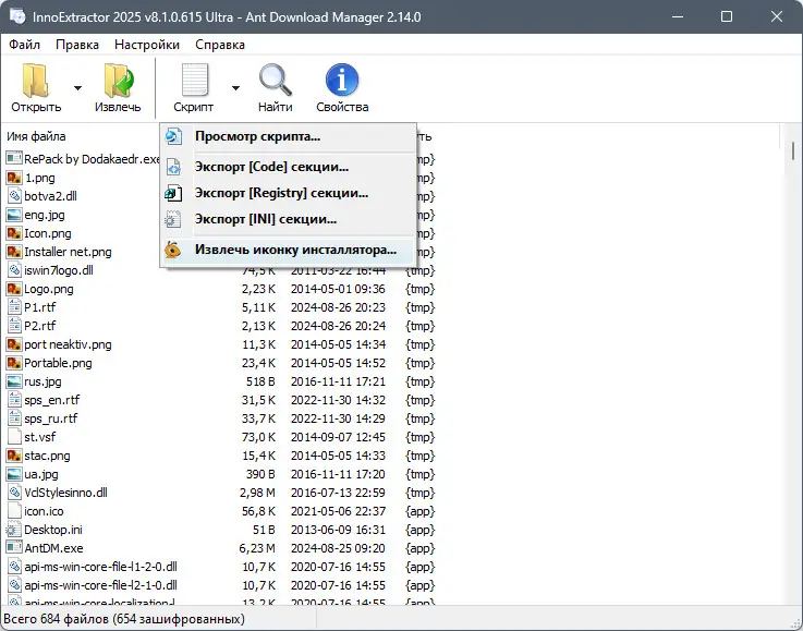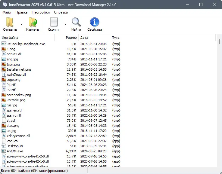 Данное приложение помогает пользователям декомпилировать и исследовать инсталляторы, созданные с помощью Inno Setup, использует технологию InnoUnp для извлечения содержимого. Воспользуйтесь возможностью изучить внутренние файлы установщика, просматривать сценарии, искать файлы по ключевым словам и работать с зашифрованными инсталляторами посредством ввода пароля. Программа поддерживает все актуальные версии Inno Setup и InnoUnp, обеспечивает полную поддержку Unicode и совместима с Windows 7, а также Windows 8/8.1, 10 и 11 на архитектурах x32/x64 Bit.