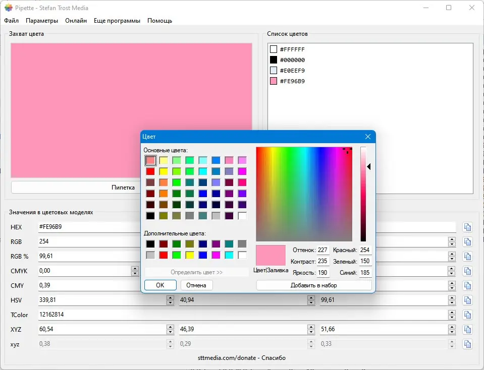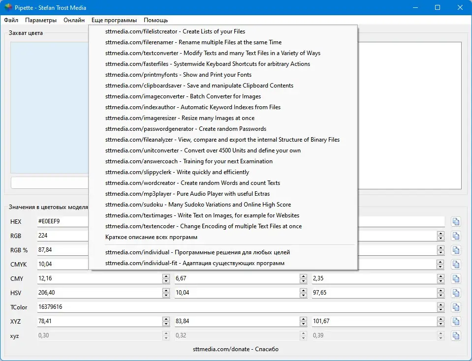 Пипетка — это бесплатное портативное приложение, предназначенное для получения и анализа цвета на экране. Оно идеально подходит дизайнерам, web-разработчикам и фотографам, работающим с редактированием изображений и созданием цветовых решений. Инструмент не требует установки и удобен в использовании, позволяя легко захватывать цвета из любых приложений или изображений и преобразовывать их в различные цветовые модели.