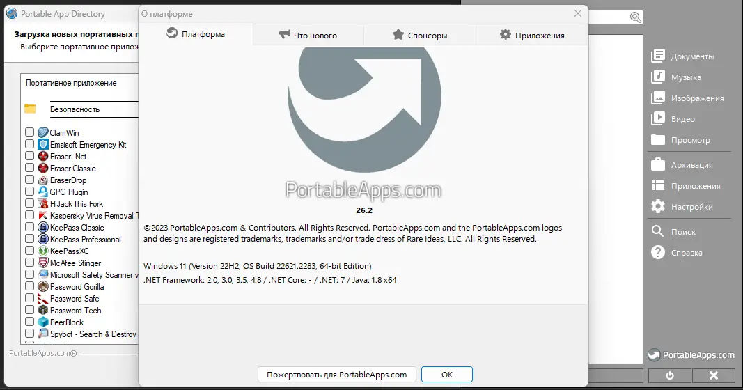 PortableApps.com Platform — это функциональная система для организации портативных программ, которая объединяет нужные вам приложения в едином интерфейсе. Она позволяет быстро создавать, обновлять и запускать портативные наборы программ, не требующие инсталляции и не оставляющие следов на компьютере. При первом запуске вы увидите список доступных приложений от разработчика — достаточно отметить галочками нужные, и платформа автоматически загрузит, распакует и подготовит их к использованию. Это значительно ускоряет работу и делает управление программами простым и интуитивным. Возможности платформы включают автоматическое обновление программ, настройку пользовательского интерфейса, создание резервных копий и организацию программ по папкам и избранному.