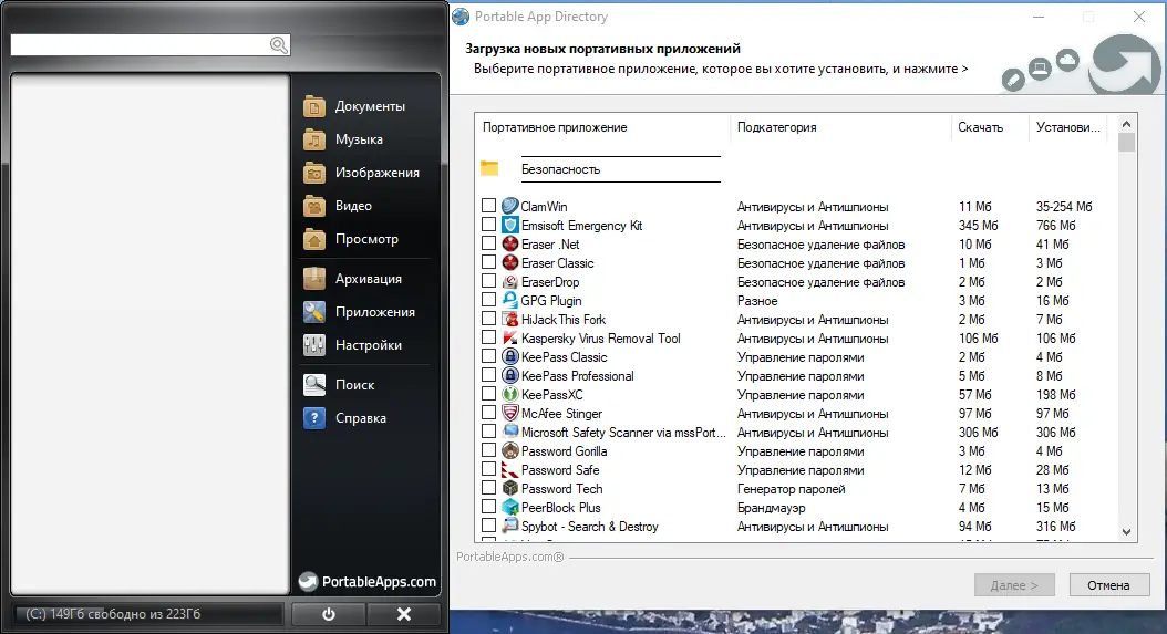 - Управление большим количеством портативных программ через удобное меню с возможностью добавления собственных категорий и избранных приложений