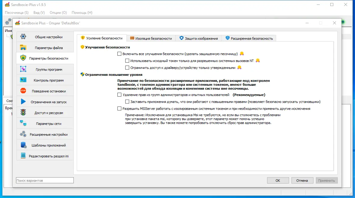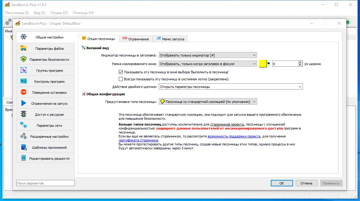 - Настроить параметры песочницы для конкретных приложений и браузеров.