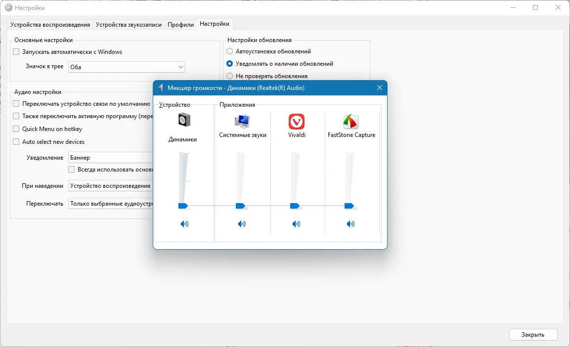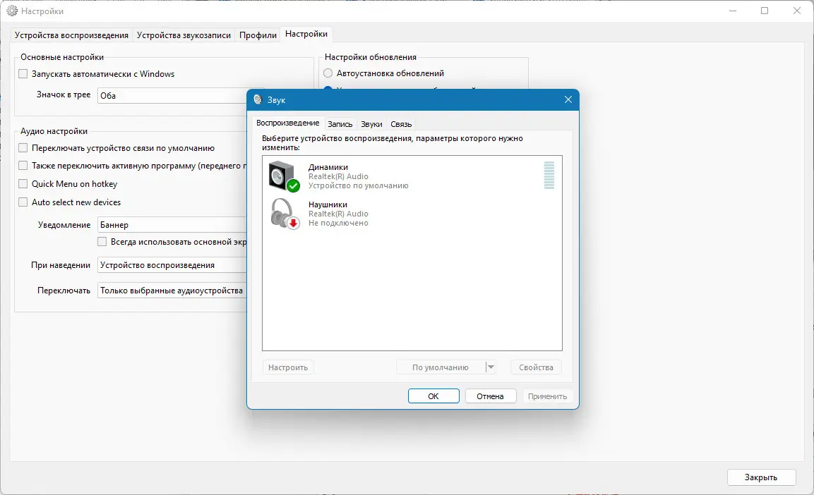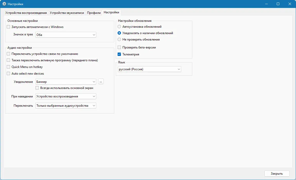 Благодаря расширенным настройкам, можно выбрать нужные устройства из списка или переключаться по очереди. Кроме того, есть возможность настроить запуск программы при старте Windows, что обеспечивает постоянную доступность утилиты. Поддерживаются различные языковые интерфейсы, включая русский, что делает использование более комфортным для русскоязычных пользователей.