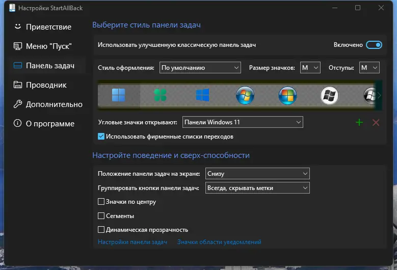 StartAllBack — это инструмент, предназначенный для восстановления привычных элементов интерфейса Windows 7 в условиях современного Windows 11. Он значительно улучшает удобство работы, возвращая функциональность и внешний вид, знакомый многим пользователям предыдущих ОС Windows. Программа интегрируется в систему без необходимости установки дополнительных служб, не требует административных привилегий и полностью локализуется на язык системы. Благодаря ей, рабочий стол и меню Пуск приобретают привычный вид, а пользователь избавляется от необходимости управлять двумя интерфейсами одновременно. Кроме того, StartAllBack позволяет настроить внешний вид и поведение меню ‘Пуск’, а также интерфейса Windows 11 — с помощью скинов, активных углов экрана и изображений кнопки.