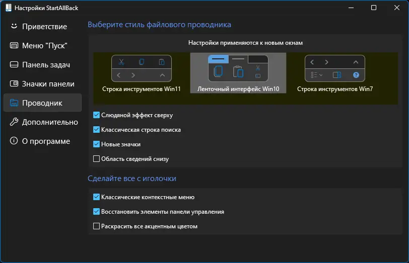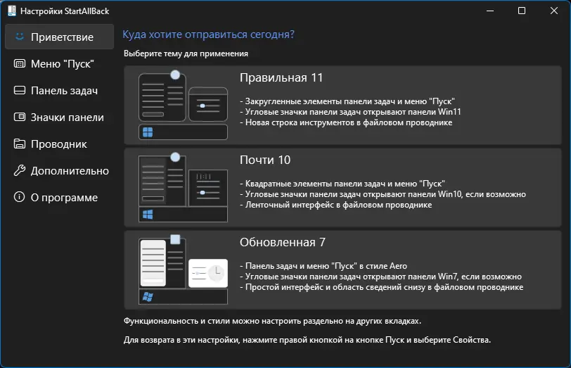 StartAllBack — это универсальное решение для восстановления классического интерфейса в Windows 11. Программа позволяет вернуть полнофункциональную кнопку меню Пуск, системные кнопки и элементы, характерные для Windows 7, а также упорядочить рабочий стол и меню, сделав их привычными и удобными. Благодаря интеграции в систему без необходимости установки дополнительных служб, она сохраняет стабильность и безопасность вашего компьютера. Программа подходит для всех версий Windows начиная с Windows 7 и выше, а также поддерживает как 32-, так и 64-битные системы.