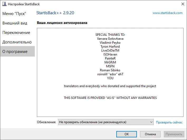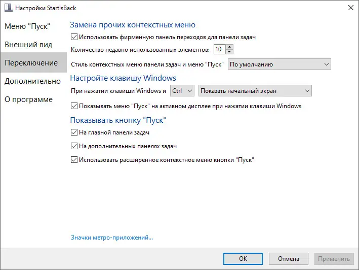 - Настройка интерфейса, скинов и поведения меню «Пуск»