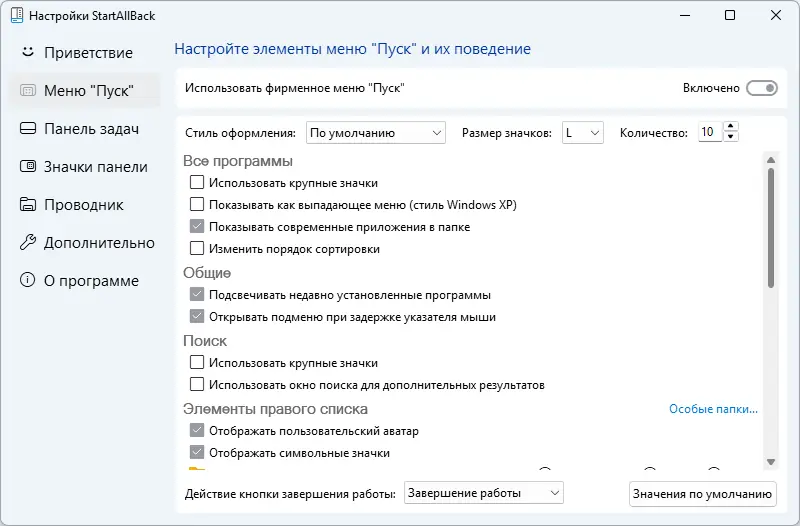 - Обладает богатым функционалом по настройке внешнего вида и поведения меню «Пуск».