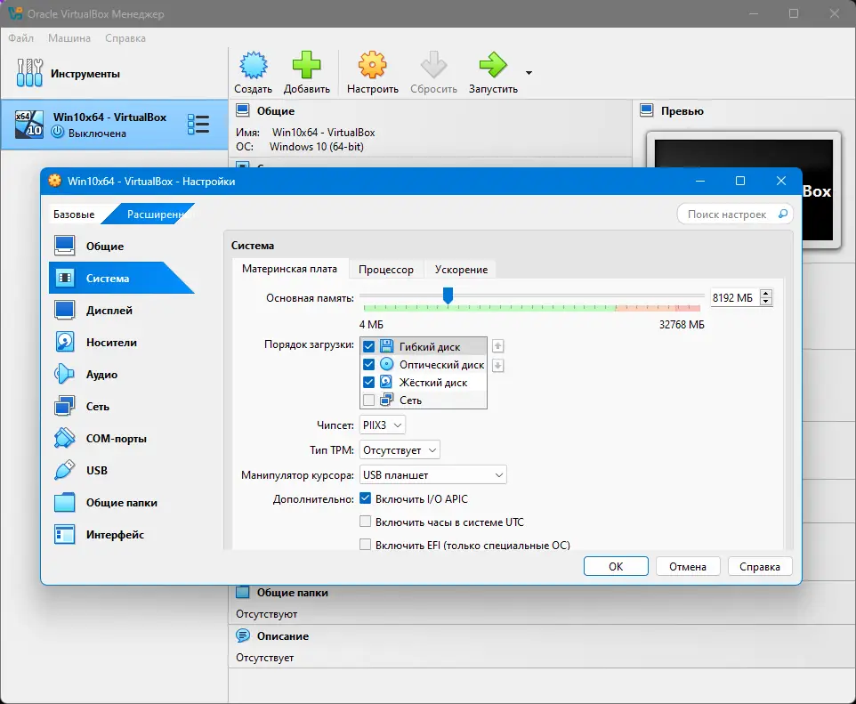 RAM | Минимум 4 ГБ, рекомендуется 8 ГБ и более для запуска нескольких виртуальных машин |