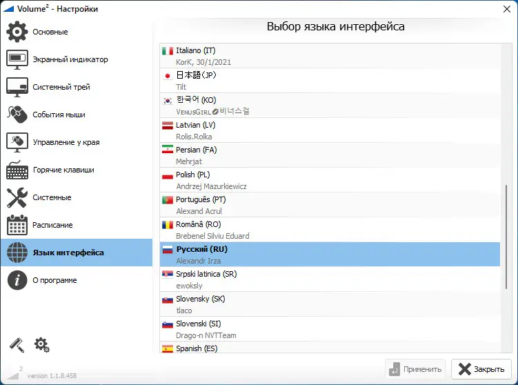 - Управление громкостью при вращении колеса мыши над иконкой в трее, панелью задач, треем, рабочим столом и заголовком окна;