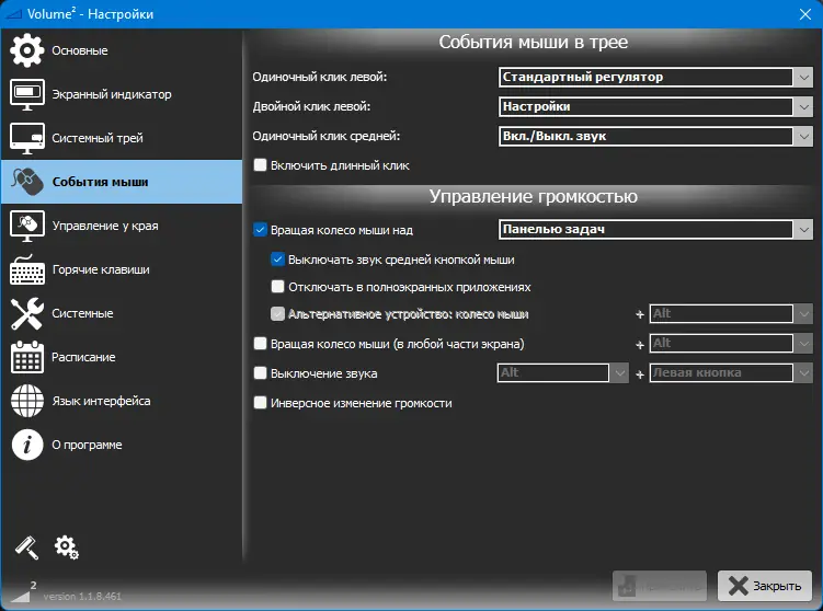 - Контроль громкости через события мыши у края экрана или при использовании горячих клавиш.