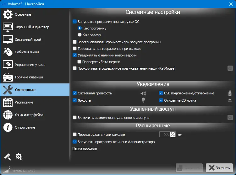 - Планировщик задач для автоматического запуска приложений или изменения громкости.