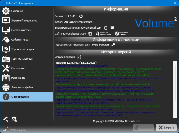 Volume2 — это многофункциональный регулятор громкости, который позволяет управлять звуком при вращении колеса мыши над различными элементами интерфейса, включая значки в трее, панель задач, заголовки окон и рабочий стол. Помимо этого, программа обеспечивает управление яркостью экрана и функцией отключения звука одним кликом. Поддержка горячих клавиш, настройка шагов изменения громкости, добавление звуковых эффектов и наличие экранного меню (OSD) делают её мощным инструментом для персонализации и быстрого контроля системных параметров.